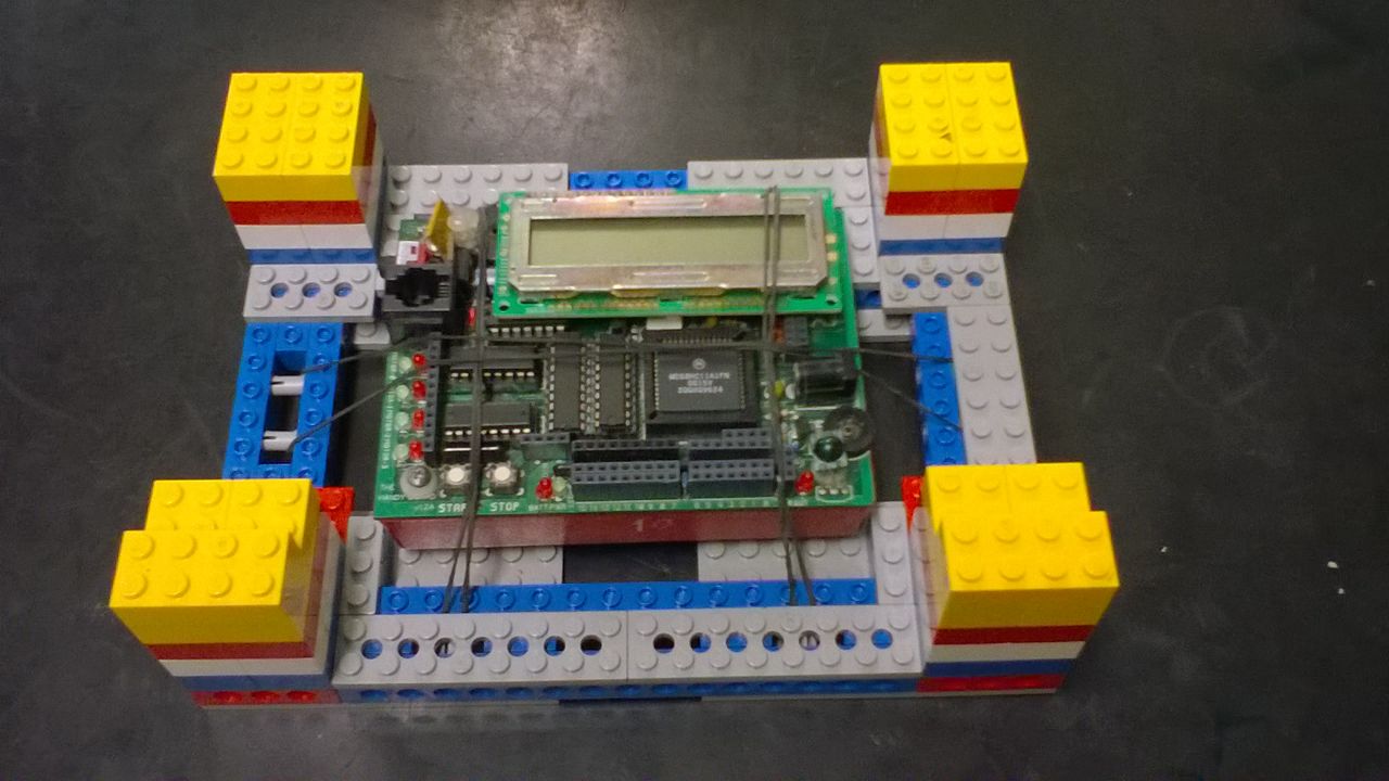 A base da Handyboard fica embaixo da estrutura principal do robô presa por elásticos e LEGO, fazendo com que o espaço destinado a ela não diminua o espaço necessário para as outras estruturas do robô. Utilizamos travas nos trilhos para delimitar o espaço máximo de trabalho do manipulador e grampos para fazer o gerenciamento dos cabos conectados à Handyboard, impedindo que estes atrapalhassem o movimento do braço e evitando o excesso de fio.