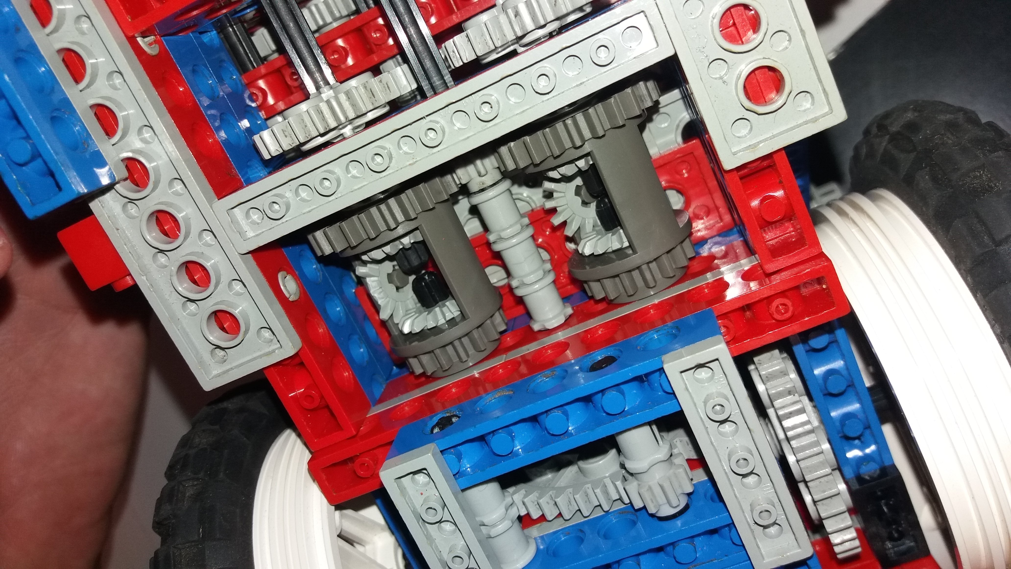 *O esquema de engrenagens segue o esquema Dual Differential Drive , que consiste no uso de dois diferenciais que dependendo do sentido que são rotacionados em relação ao outro produzem nas rodas o movimento de modo inverso. Esse modelo mostrou-útil não só na facilidade maior na programação do movimento que dependeu somente na escolha da potência e tempo do giro dos motores para realizar os movimentos , como garante que as rodas vão girar , independente do caso , com a mesma velocidade ,produzindo ,em tese , movimento retilíneos e rotações com o centro do eixo fixo .Todavia também mostrou-se uma desvantagem quanto a potência que o motor deveria entregar ,uma vez que para um motor mover ambas as rodas a força exigida será maior do que se cada roda tivesse seu próprio .