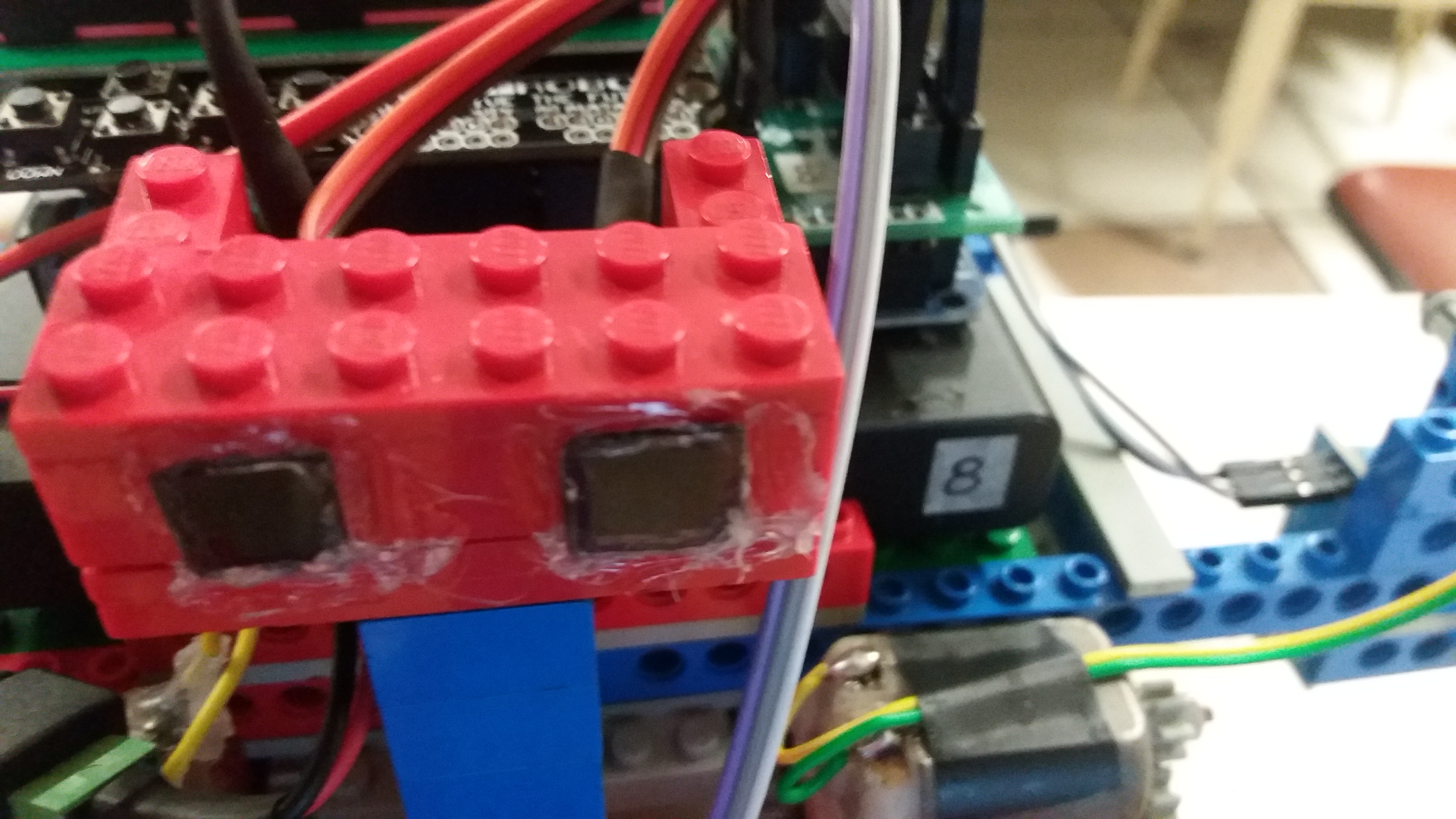 *O sensor foi posicionado na frente do robô ,virado para baixo a um altura próxima a altura do bloco , com espaço suficiente para o encaixe , assim a luminosidade do ambiente , que pode variar , pode ser atenuada , obtendo uma leitura mais precisa.
