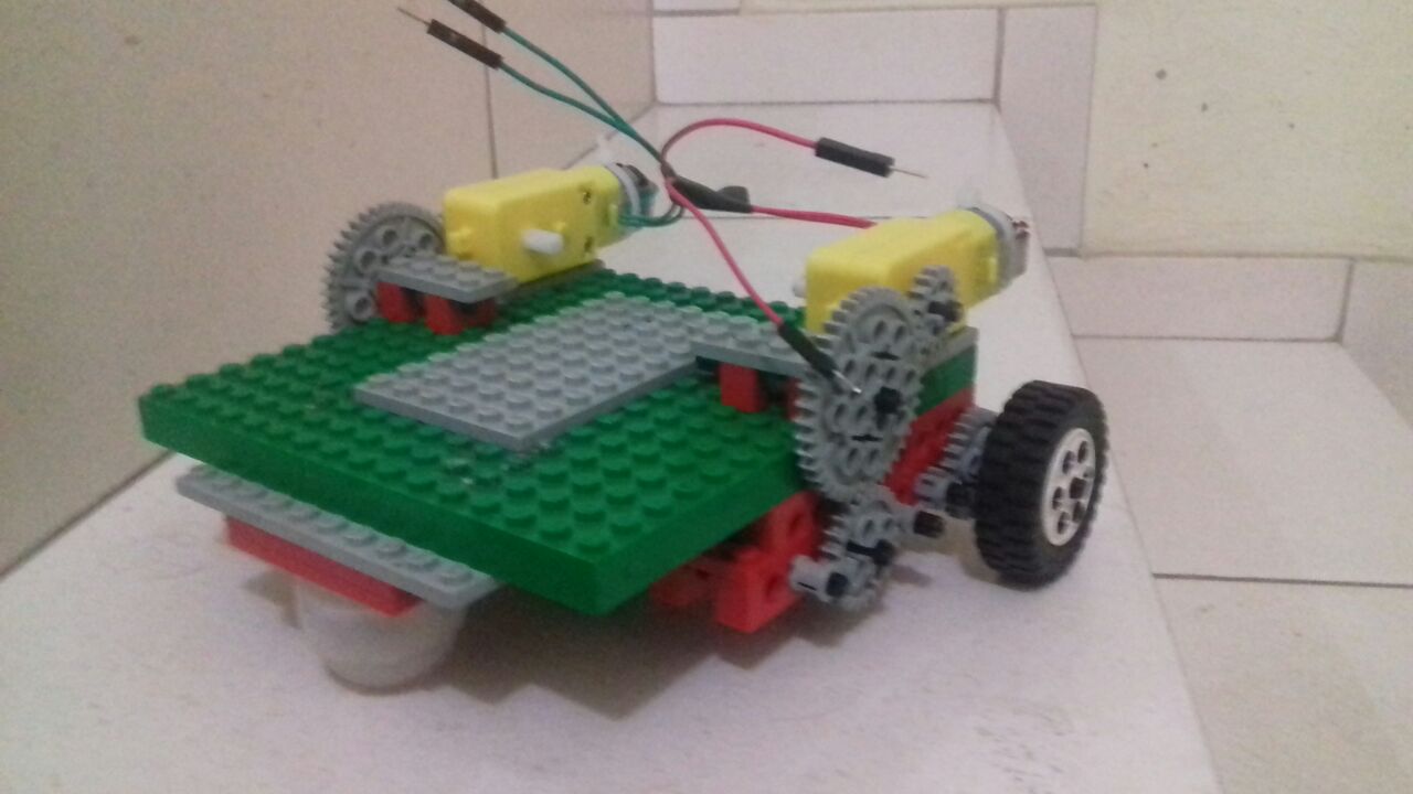 De forma a evitar flutuações abruptas de velocidade e boas saídas de torque, o sistema de transmissão conta com algumas reduções antes do movimento chegar às rodas, diminuindo a velocidade e aumentando o torque. Os motores utilizados também já possuem uma caixa de transmissão amarela que fazem um trabalho de redução semelhante inicial, mas ainda não adequado às configurações das nossas rodas. Para seguir um caminho fixado no trajeto, o robô possui dois sensores LDR que são posicionados de forma a serem espaçados por uma distância maior que a linha preta a ser seguida, que detectam o branco ao redor e informam ao robô que é necessário corrigir o movimento quando se percebe que os sensores estão acima da linha. Há também um LED branco de alta intensidade do meio dos LDRs, para iluminar a parte de baixo do robô e aumentar a diferença na detecção de uma superfície branca e preta (mesa e fita). Em relação à largada, foi instalado um LDR para o robô detectar a luz de início. O sensor foi colocado na parte inferior.