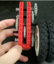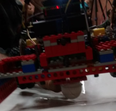 O robô do trabalho prático 3 não foi reutilizado e foi desmontando. Visando garantir manobrabilidade ao sistema, o novo robô foi desenvolvido também em triciclo, com duas rodas de tração traseira independentes e um roll-on fixado com cola quente na dianteira. Há um motor para cada eixo nos eixos traseiros, além de duas rodas (do kit do lego) para aumentar a estabilidade do robô, inteirando 4 rodas usadas no total. Abaixo, uma imagem do robô final:
