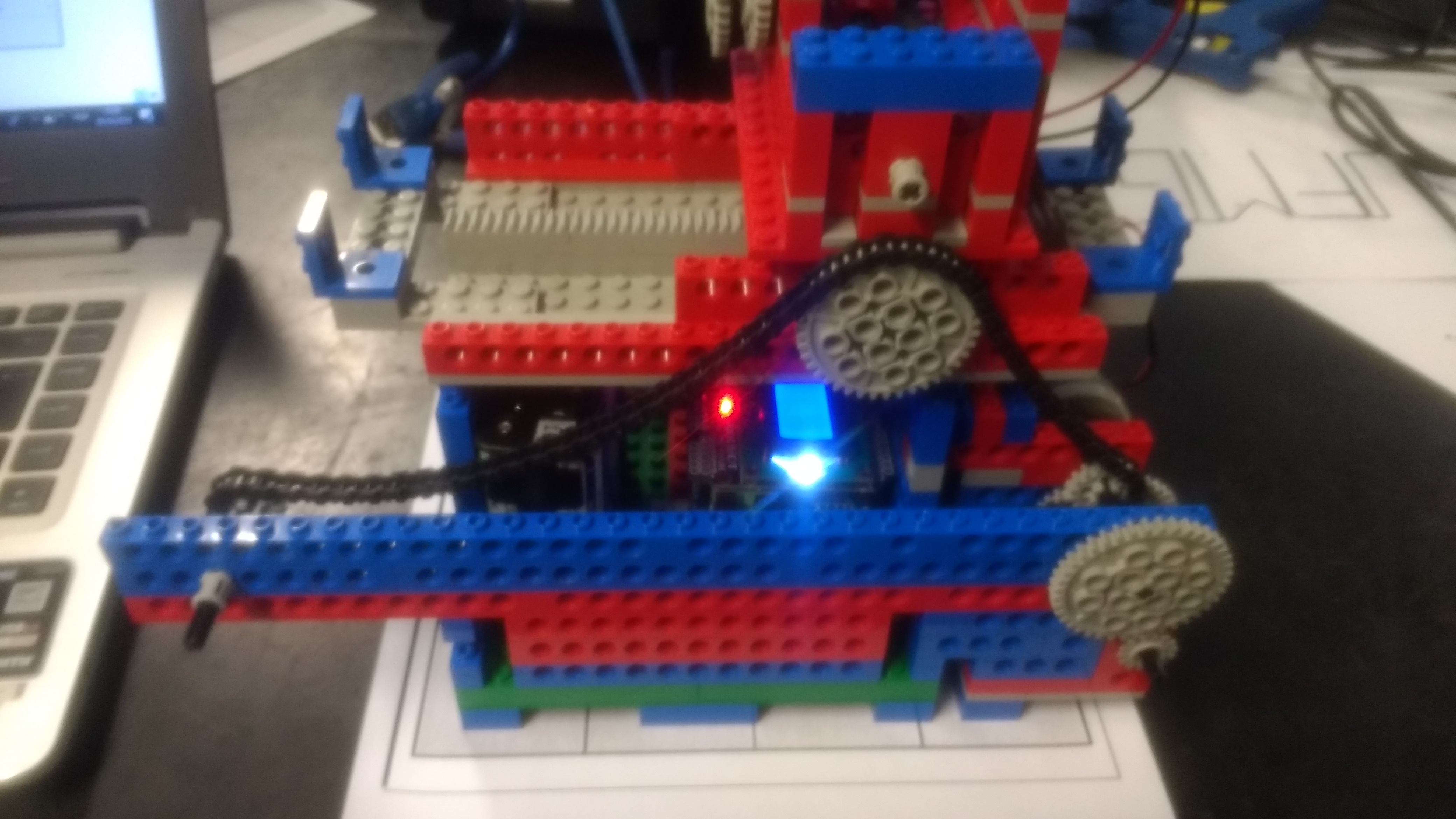 Depois, a fim de manter o robô responsável pelo o movimento do braço sob a plataforma parado, utilizamos uma correia que era ligada na engrenagem do eixo preso ao braço do robô que fazia com que ele movesse sob o trilho da plataforma, como mostra a imagem.