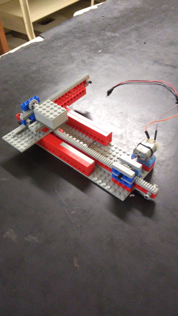 Foram montadas duas juntas prismáticas, cada uma deslocando em cada eixo. As engrenagens giravam, movendo uma cremalheira (também conhecida como engrenagem de raio infinito), fazendo com que os “bracinhos” do pequeno embrião do ENZO se movimentassem, abaixo vocês podem ver o primeiro protótipo do nosso manipulador: