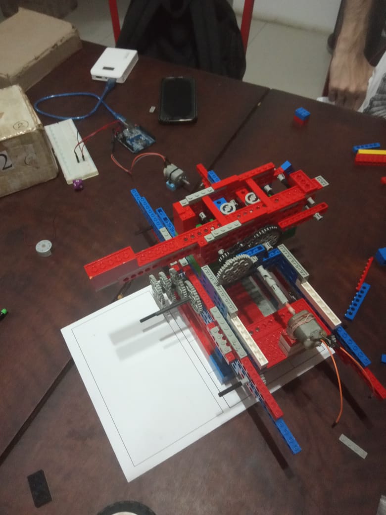 No primeiro dia de montagem, começamos a discutir como seriam feitos os movimentos para a escrita, devido à limitação de uso de 2 motores, foi fácil chegar ao consenso que, futuramente, nosso ENZINHO teria movimentos em 2 eixos (X,Y), o que nos traria, variando a programação no arduino, a possibilidade de desenhar traços retos e curvos, para assim, alcançar o objetivo do TP.