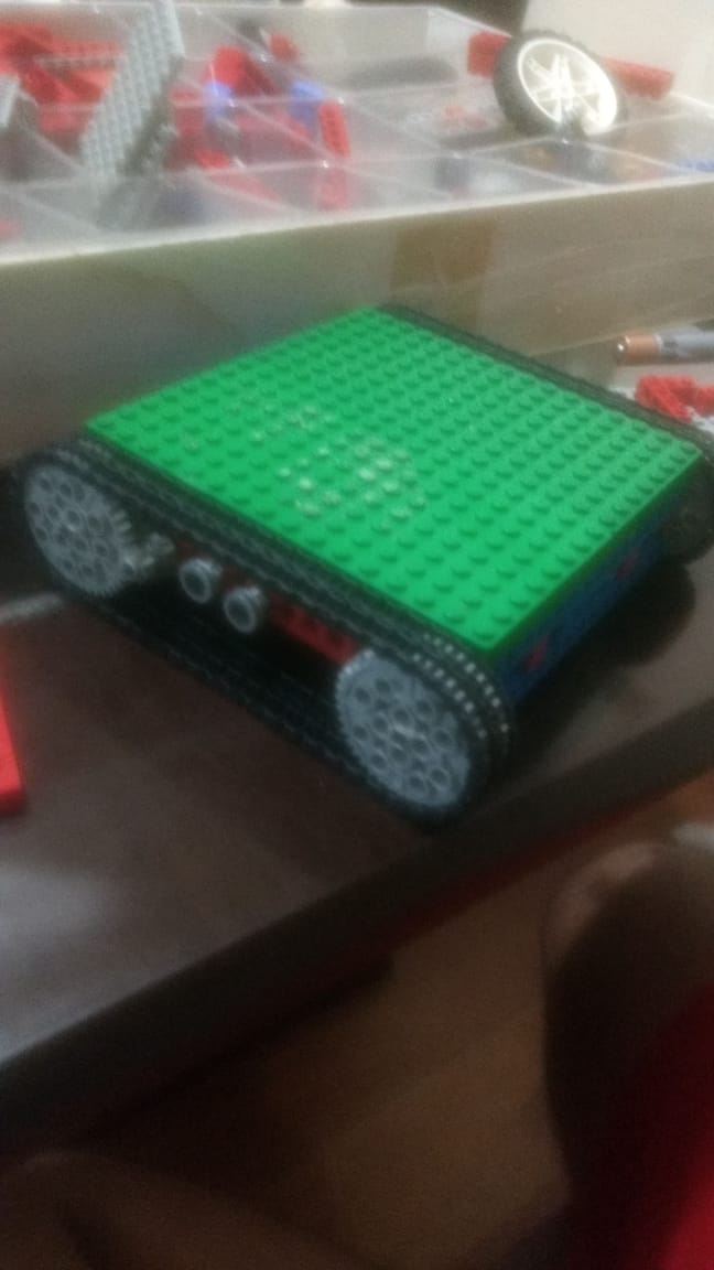 Sobre a estrutura e montagem, pensamos fora da caixinha e decidimos não utilizar rodas, e sim as correias, como se fosse um tanque de guerra. Achamos que ficaria mais chamativo, além de parecer mais simples para realizar curvas fechadas e ser um desafio a mais na montagem. Utilizamos uma base bem baixa, o suficiente para encaixar as engrenagens e os motores, e por cima tampamos para ter espaço e poder colocar/encaixar todos os sensores junto do Arduino.
