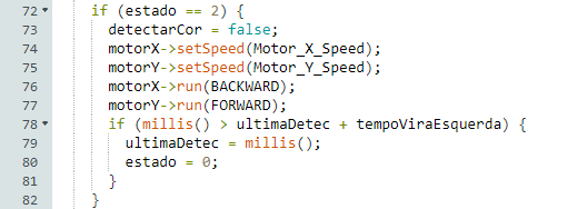 A troca de estados era realizada ao detectar um bloco e após conseguir determinar sua cor. Ela era feita através da seguinte passagem do código: