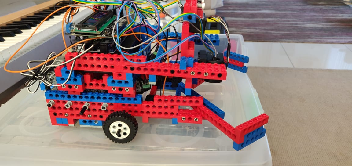 Para manter o bloco dentro do robô, fizemos uma garra, sem o uso de nenhum motor, que segurava o bloco após sua leitura. Foi feita tambem uma angulaçâo para posicionar o bloco no sensor de cores, permitindo uma maior precisão em sua leitura.