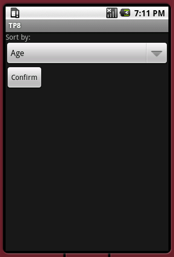 You will have to implement an interface where the user can choose one of the sorting criteria. Use a spinner to build the interface. You can learn about spinners in the tutorial. Once the user chooses a criterion, you must exhibit the list of entries according to the chosen ordering.