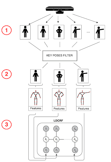 1) Skeleton data is extracted by a RGB-D sensor; 2) These frames are filtered and a set of frames containing key poses are selected; 3) Training and testing with the acquired features using the discriminative LDCRF model.