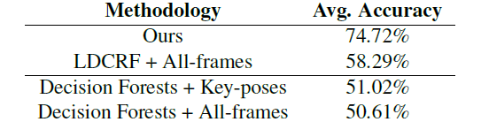Average accuracy of our methodology, LDCRF+Allframes and Decision Forests.