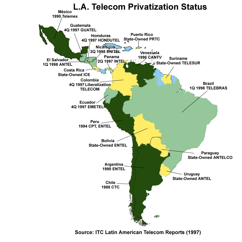 Besides that, as shown in the map below, most of Latin America has either deregulated, privatized or is in the process of privatizing its telecommunications establishment, at a rate and depth that should be observed more appreciatively by the industrialized nations.
